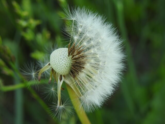 The composite blossom generally transforms into the distinctive, fluffy white seed head within a few days since these plants are self-pollinating. The umbrella-like hairs on these seeds help them sail with the wind. Because dandelion seeds require sunlight to develop, they fall in ideal spots for rapid growth.